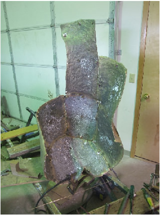 The sculpture was given a final bead-blasting to eliminate the shiny areas where grinders were used. The sculpture was heated while chemicals were applied to give it the desired color or “patina.” Wax was then applied to stabilize and protect the patina. |