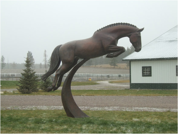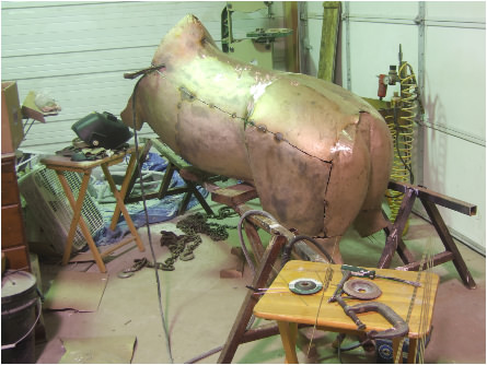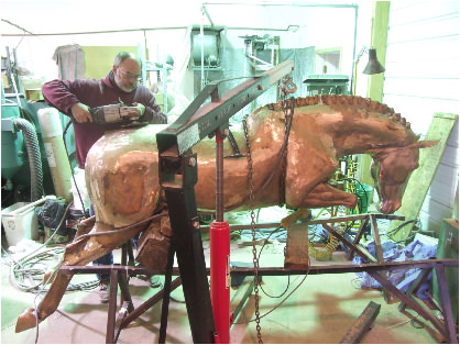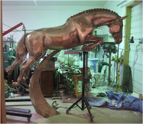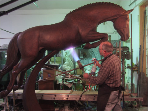 After the parts of the horse and pedestal were welded and chased, the horse was suspended and the pedestal was placed underneath and welded to the horse. |